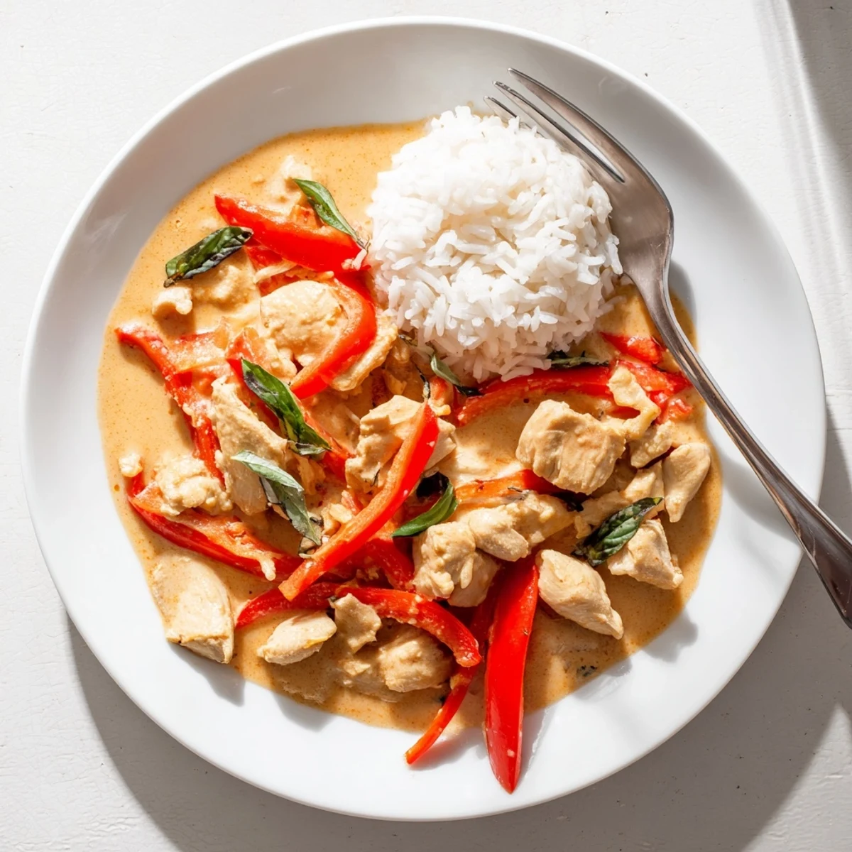 This Thai-inspired dish combines tender chicken breast pieces with a luxuriously creamy coconut curry sauce infused with fresh basil and aromatic spices. The cooking process involves lightly searing the chicken, then simmering it in a fragrant sauce made with red curry paste, coconut milk, fish sauce, and brown sugar. Red bell peppers add sweetness and color, while fresh basil leaves provide a bright, herbal finish that balances the rich sauce perfectly.