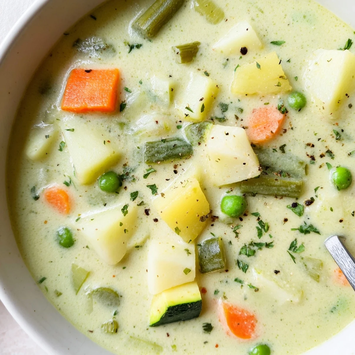 This creamy vegetable soup brings together sautéed onion and garlic, carrots, celery, potato, zucchini, green beans and peas simmered in a fragrant herb-infused broth. After vegetables are tender, blend until silky (or leave rustic chunks), then finish with cream or coconut milk for dairy-free warmth. Ready in about 45 minutes, it's an easy, nourishing bowl that pairs well with crusty bread or a light salad.