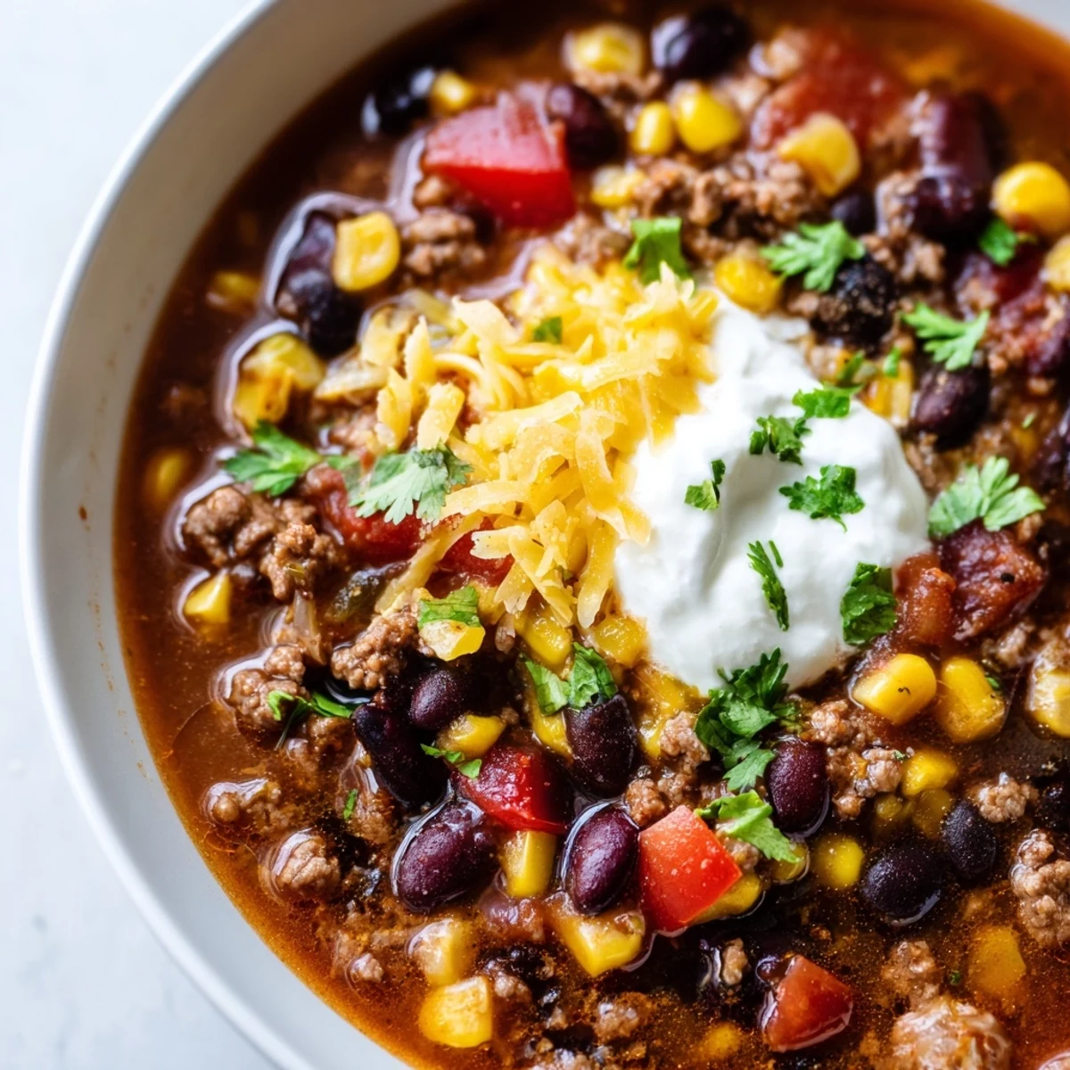 This comforting Mexican-inspired soup combines seasoned ground beef with black beans, kidney beans, corn, diced tomatoes, and aromatic vegetables. The slow cooker melds flavors together beautifully, creating a rich, satisfying meal that's perfect for feeding a crowd or meal prep. With just 15 minutes of prep time, you can let it simmer all day and come home to a delicious, warming dinner.