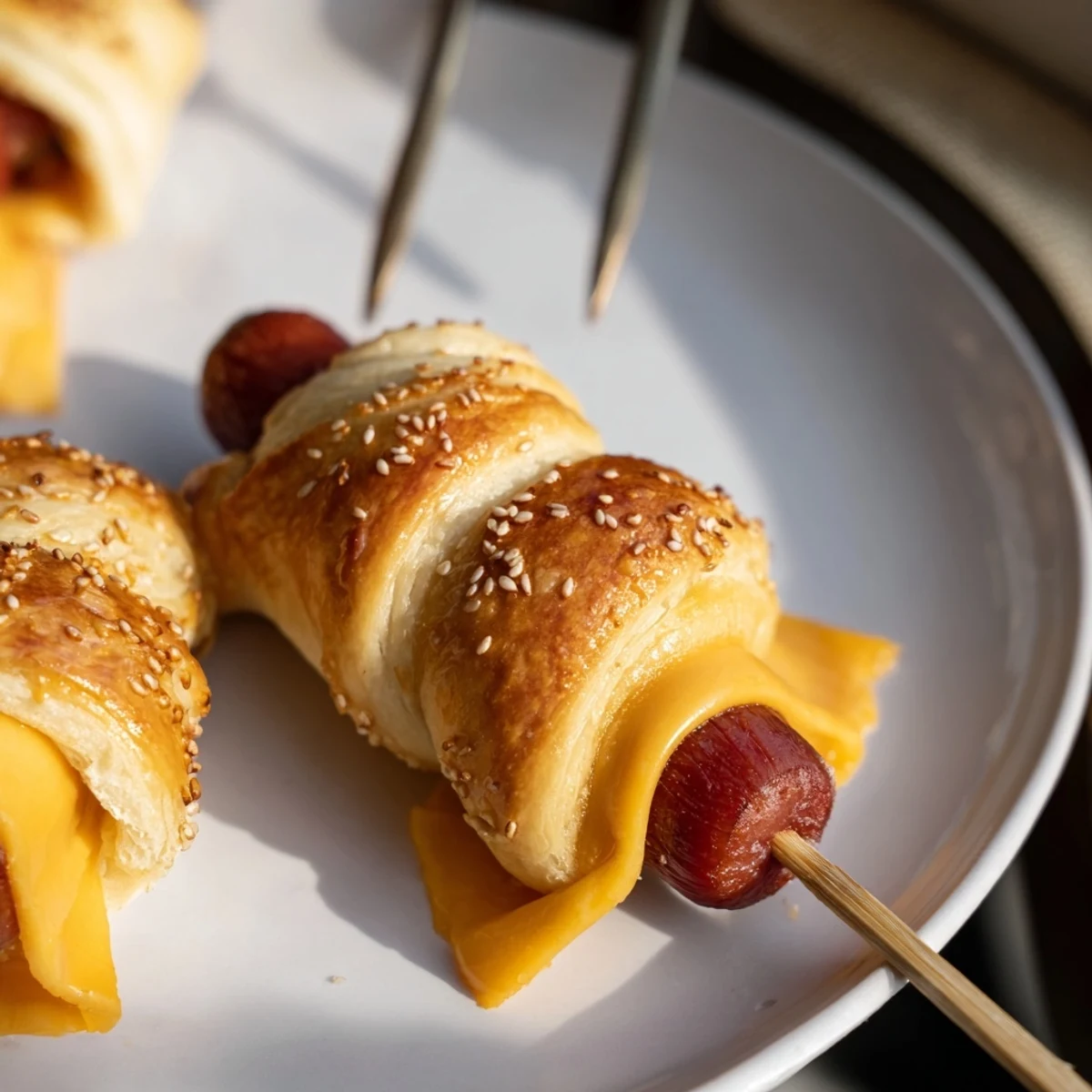 Thread hot dogs on skewers, wrap each in a crescent dough triangle (add a cheese slice if desired), brush with melted butter, sprinkle garlic powder and seeds, then bake at 375°F until the pastry is golden and cooked through. Quick assembly, about 30 minutes total. For more kick use pepper jack or a light hot sauce; supervise kids handling skewers.