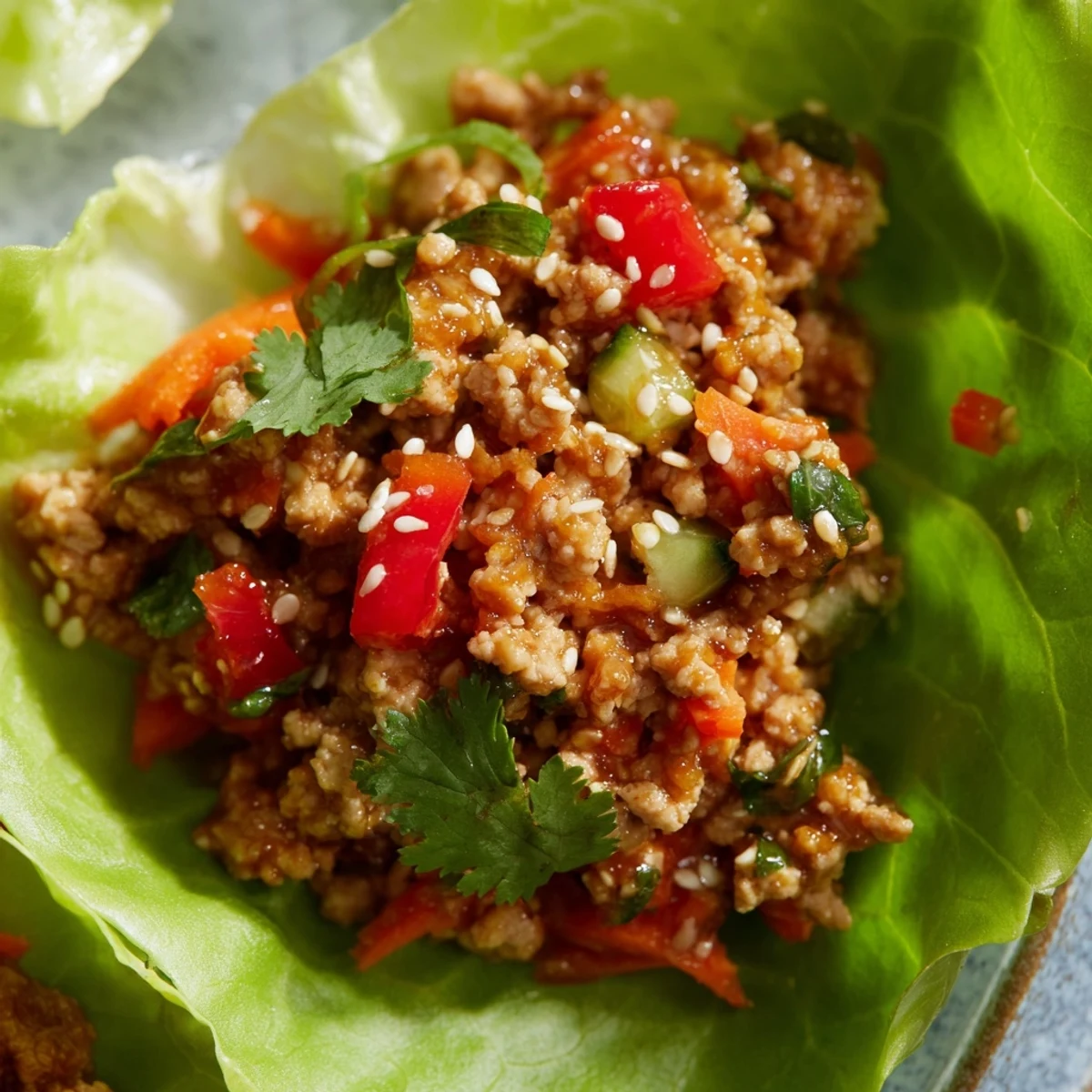 These vibrant lettuce bowls bring together lean ground turkey, crisp vegetables, and a savory Asian-inspired sauce for a light yet satisfying meal. The turkey is browned with aromatics like garlic and onion, then coated in a blend of soy sauce, hoisin, rice vinegar, and sesame oil. Fresh vegetables including bell pepper, carrot, and cucumber add color and crunch, while the lettuce cups provide the perfect low-carb vessel for this flavorful filling.