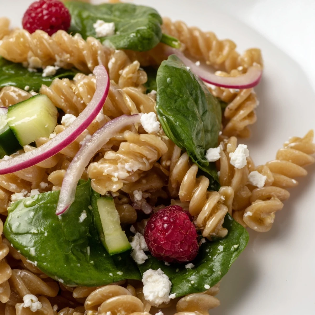 This vibrant cold pasta dish brings together the sweetness of fresh raspberries with creamy feta cheese and tender baby spinach. The homemade vinaigrette balances tangy lemon and raspberry vinegar with a hint of honey, creating a perfect harmony of flavors.