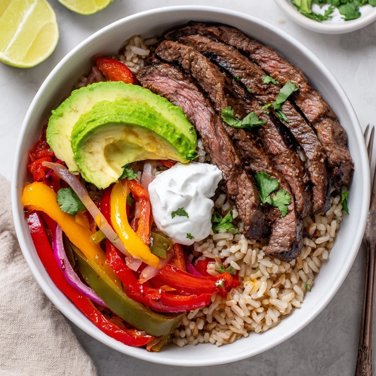 This vibrant bowl layers lime-marinated steak seared until caramelized with sauteed bell peppers and red onion. Served over brown rice or quinoa with warm black beans, avocado, cherry tomatoes and a sprinkle of cheese and cilantro. Quick to assemble, can be grilled, swapped to cauliflower rice for lower carbs, and dressed with yogurt and lime wedges.